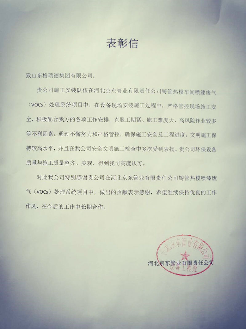 山东格瑞德集团环保工程公司为河北京东管业有限公司VOCs治理,在工程中,山东格瑞德集团环保工程公司全程参与VOCs治理施工过程。格瑞德一直秉承着“质量管理零失误、产品质量零缺陷”的理念,在产品制造上精益求精。此次为河北京东管业有限公司VOCs治理,能够充分的体现环保工程公司的整体实力,保障环保设备高效稳定地运行。