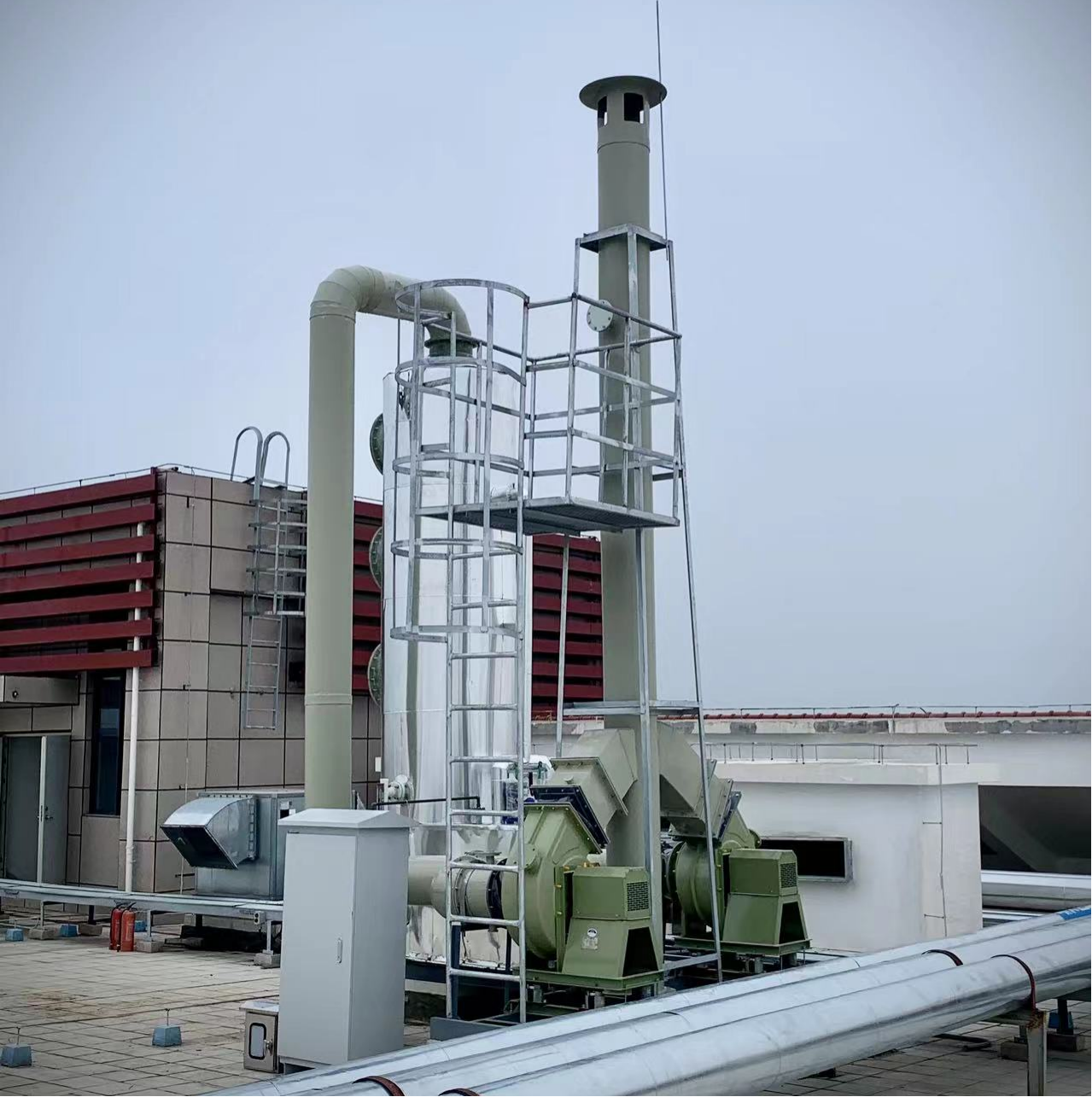 喷淋塔、风机、电控、烟囱支架、检测平台、爬梯护栏,设备间连接管道。