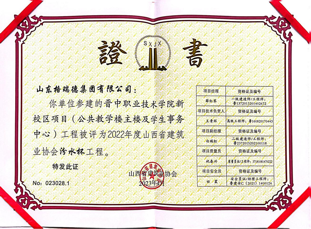 由山西省建筑业协会下发《关于公布2022年度及2021年度(省外工程)山西省建筑业协会汾水杯工程评价名单的通知》文件中,山东格瑞德集团有限公司承揽“晋中职业技术学院新校区项目(公共教学楼主楼及学生事务中心)”工程被评为2022年度山西省建筑业协会汾水杯工程。