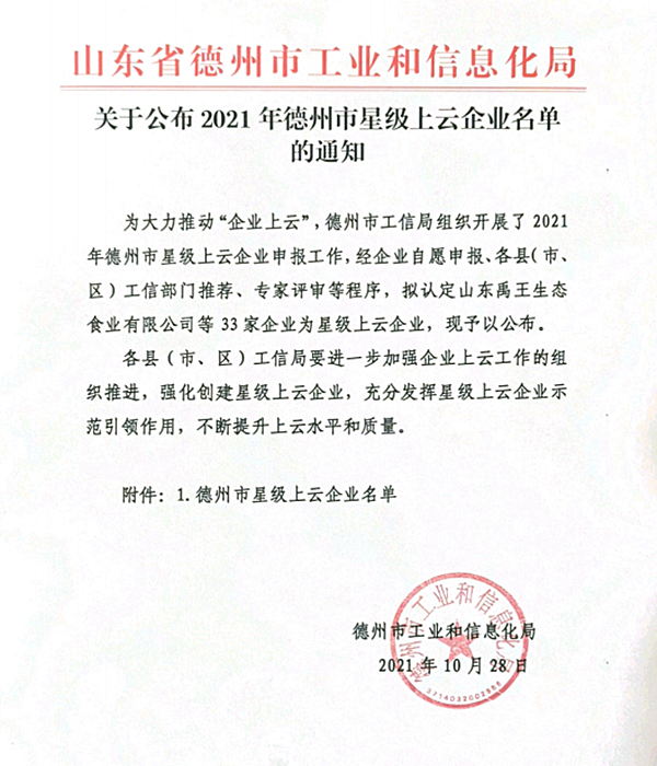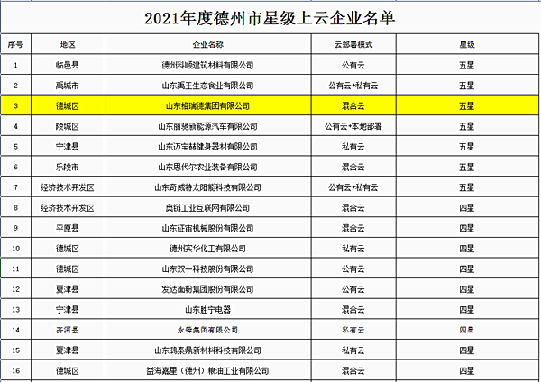 为推动德州市制造业迈向中高端,提升两化融合和智能制造发展水平,提高企业发展动能和竞争力。德州市工业和信息化局组织开展了2021年德州市星级上云企业评选活动,格瑞德集团获评为五星级上云企业。