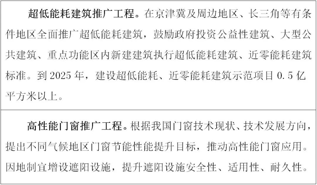 以《建筑节能与可再生能源利用通用规范》确定的节能指标要求为基线,启动实施我国新建民用建筑能效“小步快跑”提升计划,分阶段、分类型、分气候区提高城镇新建民用建筑节能强制性标准,重点提高建筑门窗等关键部品节能性能要求,推广地区适应性强、防火等级高、保温隔热性能好的建筑保温隔热系统。推动政府投资公益性建筑和大型公共建筑提高节能标准,严格管控高耗能公共建筑建设。引导京津冀、长三角等重点区域制定更高水平节能标准,开展超低能耗建筑规模化建设,推动零碳建筑、零碳社区建设试点。在其他地区开展超低能耗建筑、近零能耗建筑、零碳建筑建设示范。推动农房和农村公共建筑执行有关标准,推广适宜节能技术,建成一批超低能耗农房试点示范项目,提升农村建筑能源利用效率,改善室内热舒适环境。