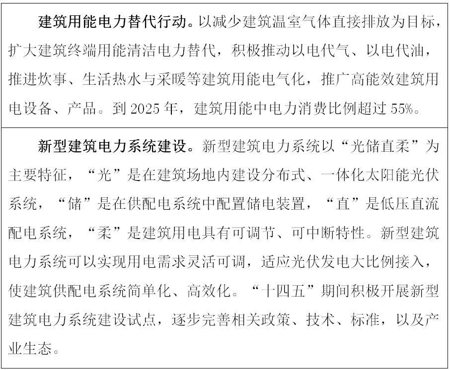 充分发挥电力在建筑终端消费清洁性、可获得性、便利性等优势,建立以电力消费为核心的建筑能源消费体系。夏热冬冷地区积极采用热泵等电采暖方式解决新增采暖需求。开展新建公共建筑全电气化设计试点示范。在城市大型商场、办公楼、酒店、机场航站楼等建筑中推广应用热泵、电蓄冷空调、蓄热电锅炉。引导生活热水、炊事用能向电气化发展,促进高效电气化技术与设备研发应用。鼓励建设以“光储直柔”为特征的新型建筑电力系统,发展柔性用电建筑。