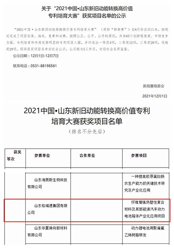 近年来,格瑞德集团先后荣获“2018年度国家知识产权优势企业”、“2021中国 山东新旧动能转换高价值专利培育大赛”优胜奖、“德州市高价值专利”、2022年度知识产权强国建设示范企业等诸多奖项称号。