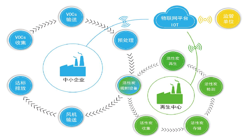 该模式已经成功应用于众多中小企业的VOCs治理工程,工程建设运行实践表明,该模式使分散的、间歇排放的、难以原位再生的中小风量有机废气得到净化,达成完整的治理闭环模式,处理效率高,废气达标排放,投资运维费用低,同时可以减少固体废弃物的产生、降低企业的污染治理成本,实现活性炭资源的循环利用和全生命周期管理,社会、经济、生态效益显著。