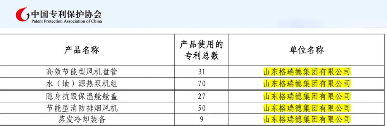 格瑞德集团水(地)源热泵机组、高效节能型风机盘管、节能型消防排烟风机、蒸发冷却装备、隐身抗毁保温舱舱盖5个产品入选国家专利密集型产品。格瑞德集团产品的成功认定不仅激发了集团新动力,增添了新动能,也体现了集团专利工作的显著成果。