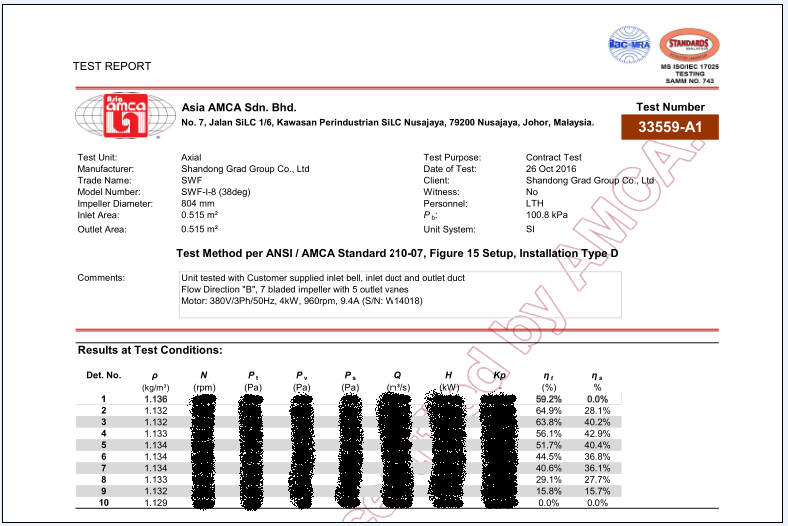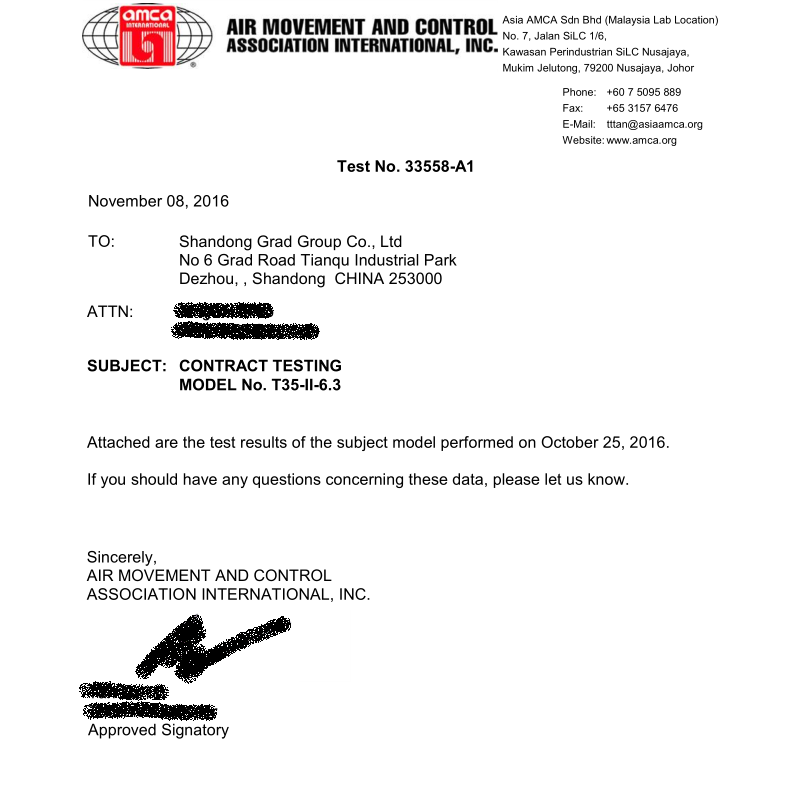 此次集团正在申报办理的SWF系列、T35系列风机CRP产品性能认证,已由AMCA亚洲区域马来西亚实验室完成空气动力性能、噪音测试工作,测试结果均合格,风机能效等级分别达到FEG67、FEG60,充分显示了格瑞德集团风机产品的优异性能,为产品获得最终认证奠定了基础,也为风机系列产品进军国际市场拿到了“入场券”。