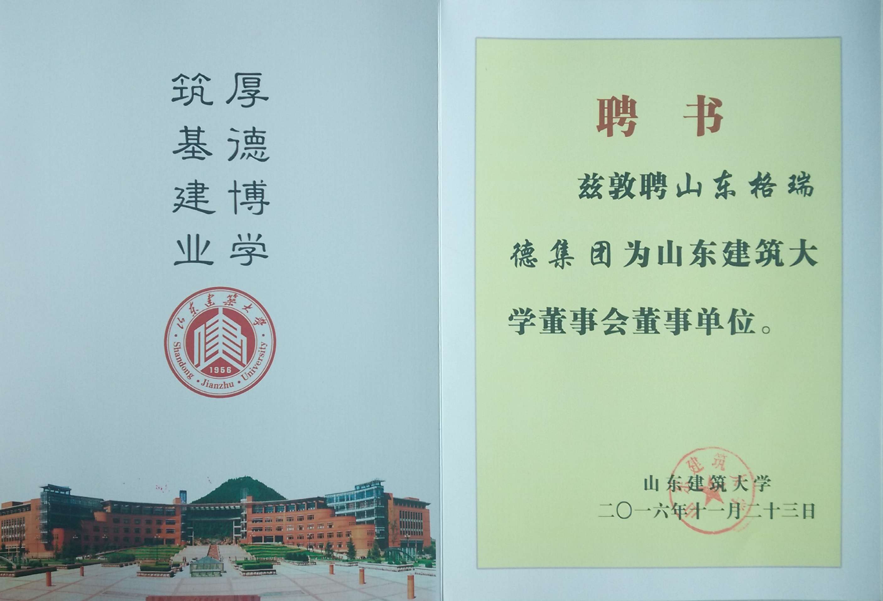 11月25日,山东格瑞德集团捐赠仪式暨校企合作座谈会在山东建筑大学召开,集团董事长管印贵、行政总监马利忠以及业务接待部长尹兴华参会,山建副校长范存礼参会。