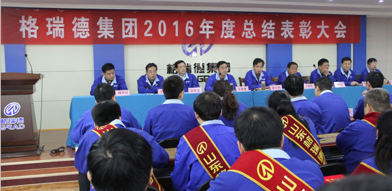 会议由集团监事长王春雷主持,集团副董事长王春和宣读了《格瑞德集团2016年度总结表彰决定》,集团董事长管印贵在总结2016年度工作的基础上,确立了2017年的工作目标和任务。会上,共有10个先进团队、50名先进工作者受到了隆重表彰。突出技术创新团队代表温雪莹同志、突出销售团队代表张连秀同志、突出管理推动团队代表谈庆松同志以及先进工作者代表济南办事处王建鹏同志分别在会上做了典型发言。