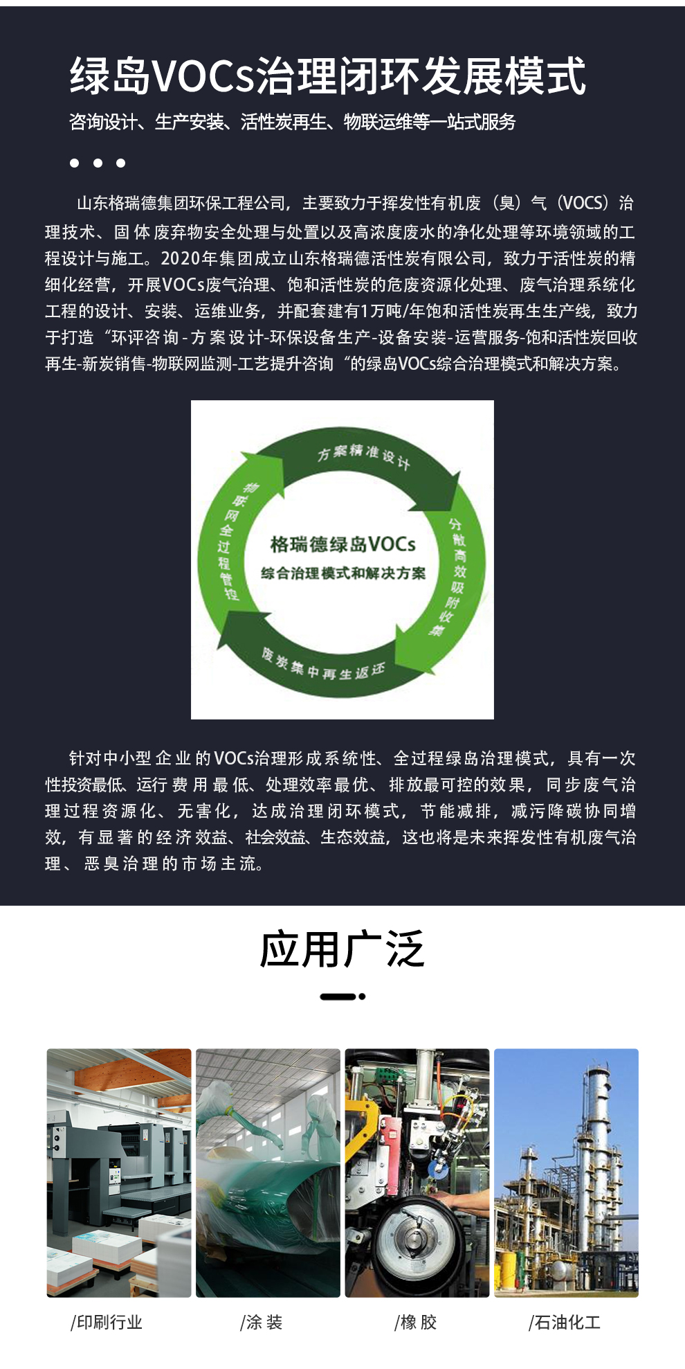 格瑞德集团致力于挥发性有机废气治理、固体废弃物安全处理处置、高浓度废水等净化处理工程,提供方案论证、工程设计、施工管理、安全运营、维护保养、清洁生产、环境建设等综合环保解决方案。