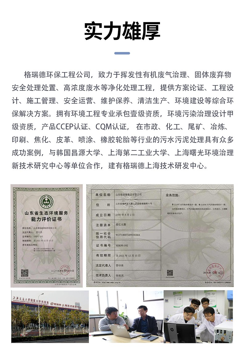 格瑞德集团致力于挥发性有机废气治理、固体废弃物安全处理处置、高浓度废水等净化处理工程,提供方案论证、工程设计、施工管理、安全运营、维护保养、清洁生产、环境建设等综合环保解决方案。