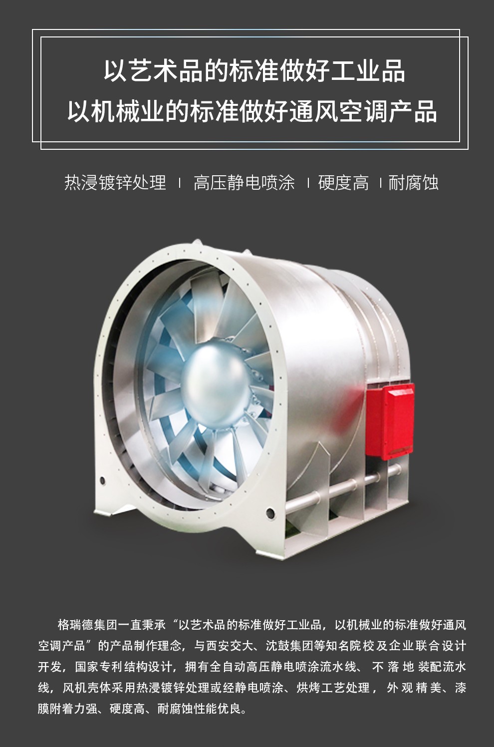 格瑞德致力于让人工环境更美好,通过打造空调工程、通风人防、复合材料、环保工程领域的全过程解决方案来满足客户需求,格瑞德构建了包括品牌规划、系统设计、技术开发、产品制造、整体施工、维护服务、检测认证、人才交流、产业集群的全生命周期产业链和产业生态。