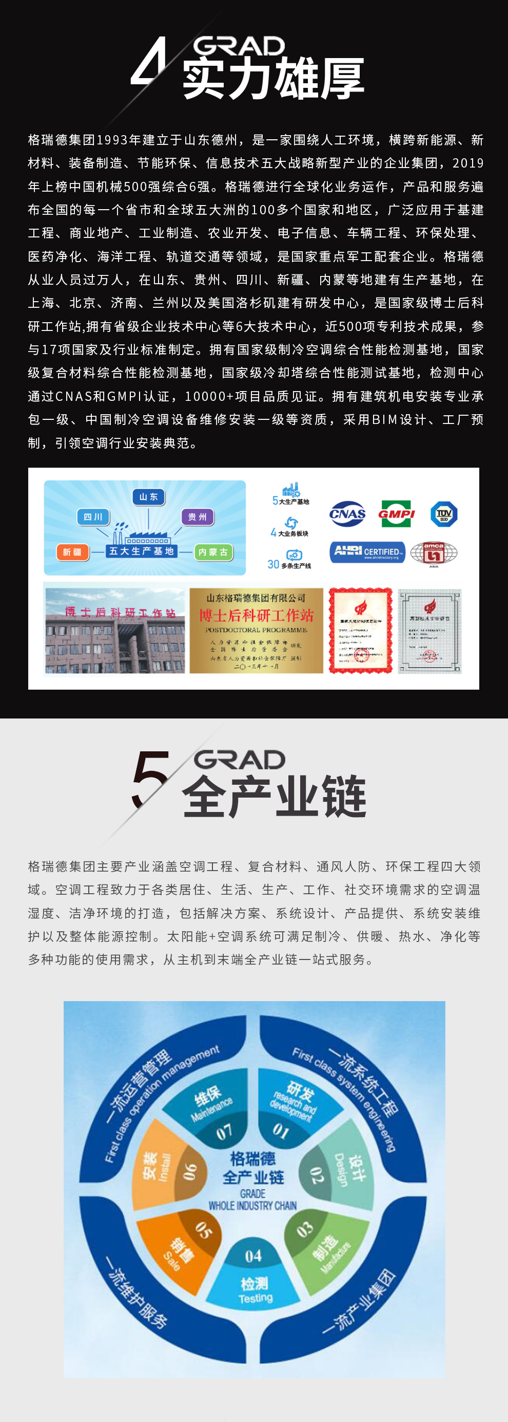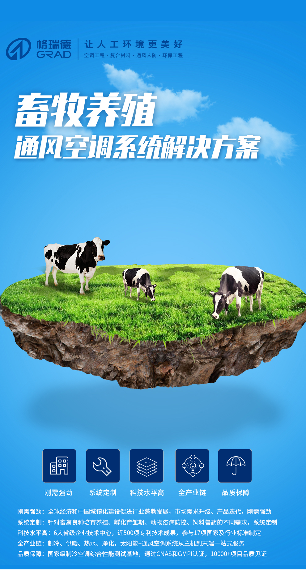 格瑞德致力于让人工环境更美好,通过打造空调工程、通风人防、复合材料、环保工程领域的全过程解决方案来满足客户需求,格瑞德构建了包括品牌规划、系统设计、技术开发、产品制造、整体施工、维护服务、检测认证、人才交流、产业集群的全生命周期产业链和产业生态。